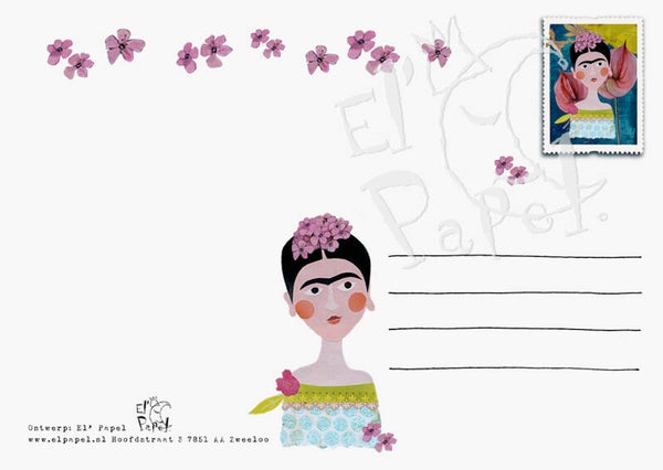 Ook de achterkant is ook helemaal in stijl, met Frida in het klein en bloemendecoratie. In de rechterhoek een Frida postzegel (verkleinde versie van de voorkant), er moet uiteraard nog wel een echte postzegel geplakt worden, als je de kaart wilt versturen.