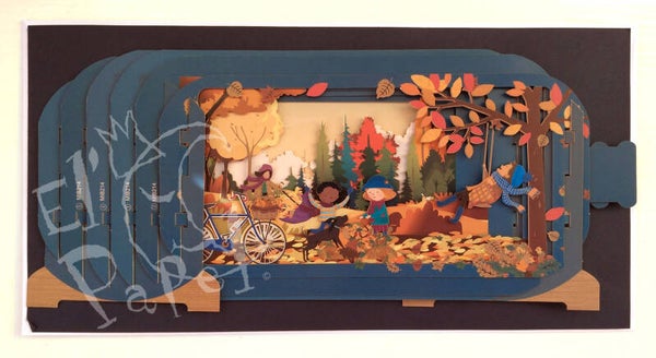 De kaart heeft uitgevouwen 6 lagen en wordt dan een kijkdoos in de vorm van een fles.