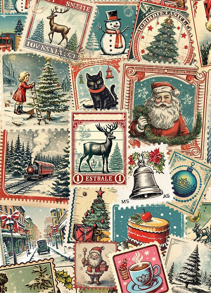 Gave Kerstkaart met de tekening van een collage met allemaal nostalgische (retro) postzegels.