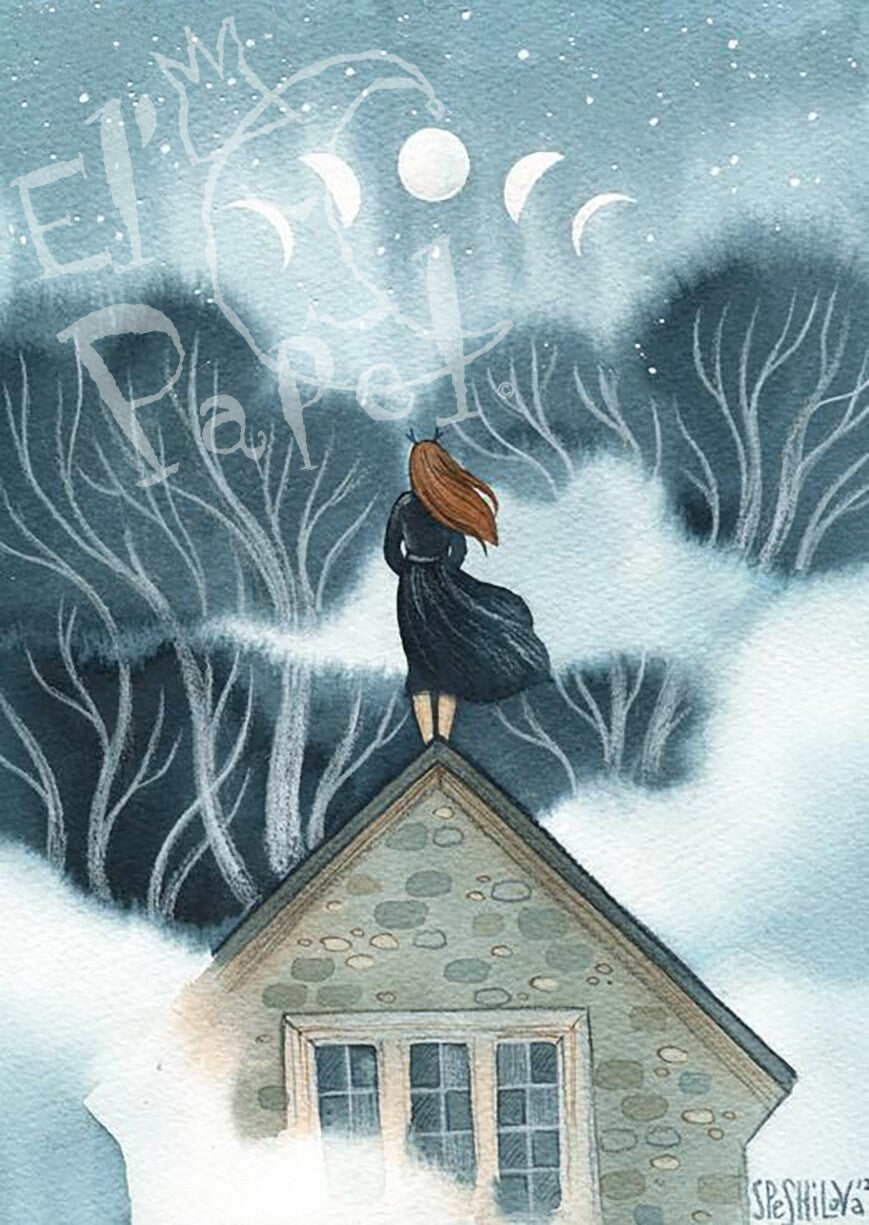 Sprookjesachtige kaart met roodharige vrouw (van achteren gezien) op de punt van een dak, aan de hemel zie je de maan in de verschillende fasen (van wassende maan, naar volle maan, naar afnemende maan - of volle maan, nieuwe maan, eerste kwartier en laatste kwartier). Geïllustreerd door Anna Speshilova.