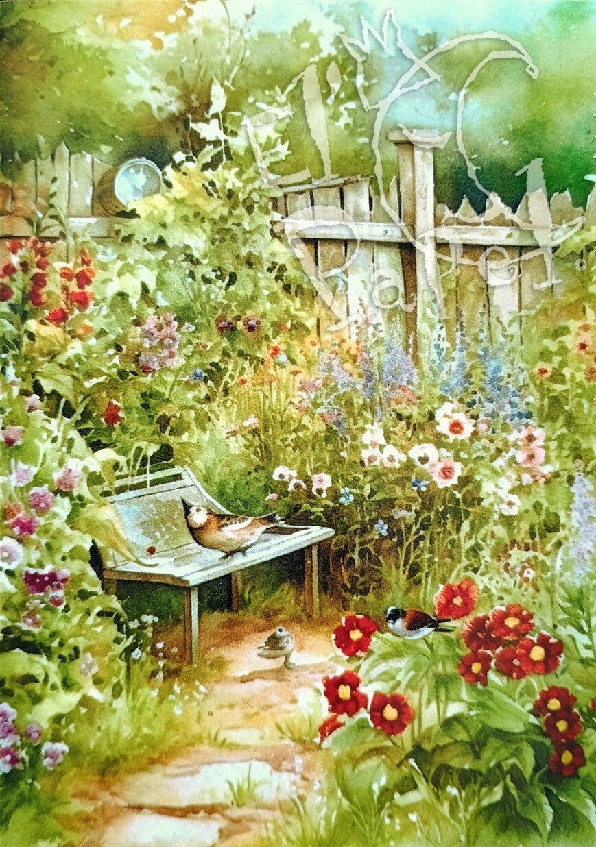 Leuke aquarel illustratiekaart met een tuin met uitbundige bloeiende bloemen (veel stokrozen) en een zingend vogelje op het bankje in de tuin.