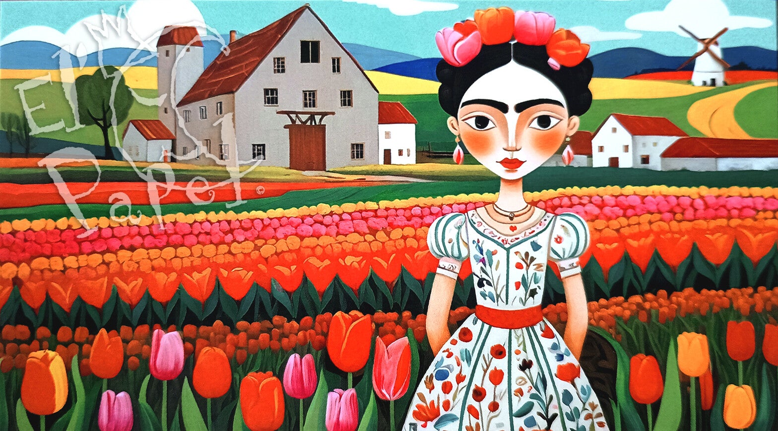 Een geweldig vrolijke Frida Kahlo kaart met Frida in een veld (landschap) vol met vooral rode tulpen.