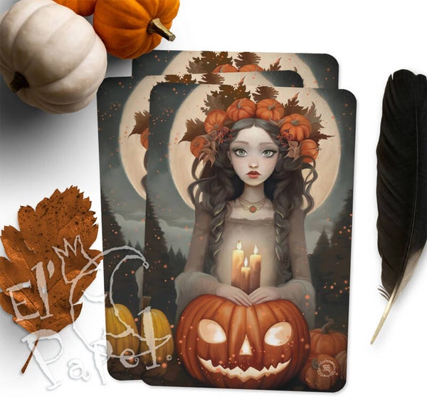 Met een jonge vrouw met twee dikke vlechten voor een grote volle maan. Voor en naast haar staan verschillende pompoenen, waarvan de middelste de grootste is met een uitgesneden gezicht en brandende kaarsjes er bovenop.