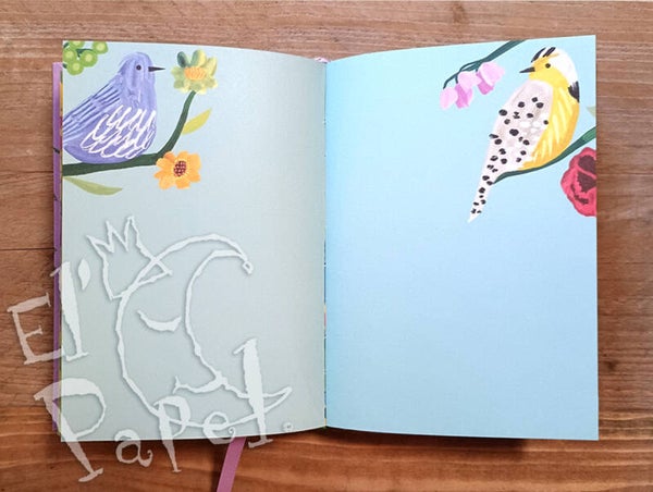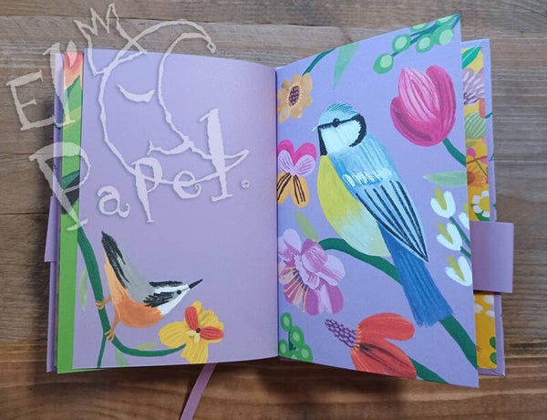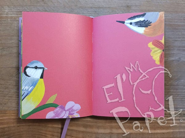 Een absolute beauty, dit 'Birdhaven - het Vogelparadijs' journal (noteboek-notitieboek-dagboek) van Roger la Borde, met vrolijke vogeltjes (die spelen de hoofdrol in dit boekje) op takken, tussen kleurrijke bloemetjes, tegen een paarse achtergrond.