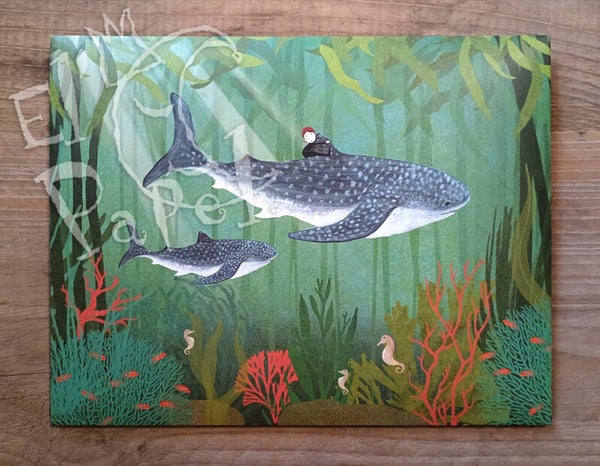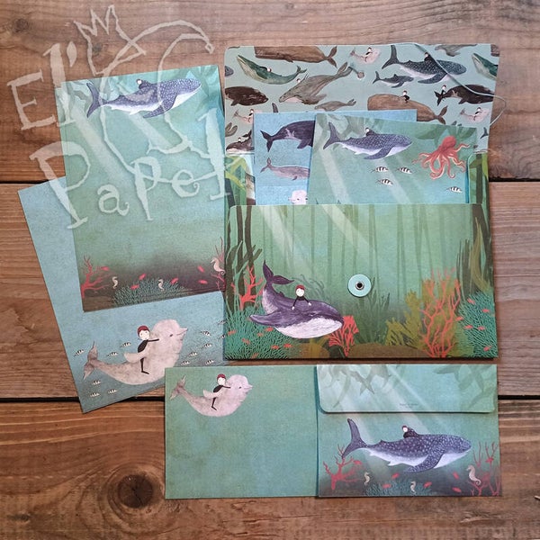 Prachtige, luxe Roger la Borde writing set 'Whale Song' (vert. 'Het lied van de walvis'), met een onderwaterwereld illustratie, met allemaal zeedieren, zoals vissen, een dolfijn (bereden door een soort van Roodkapje), zeepaardjes, walvis en koraal.