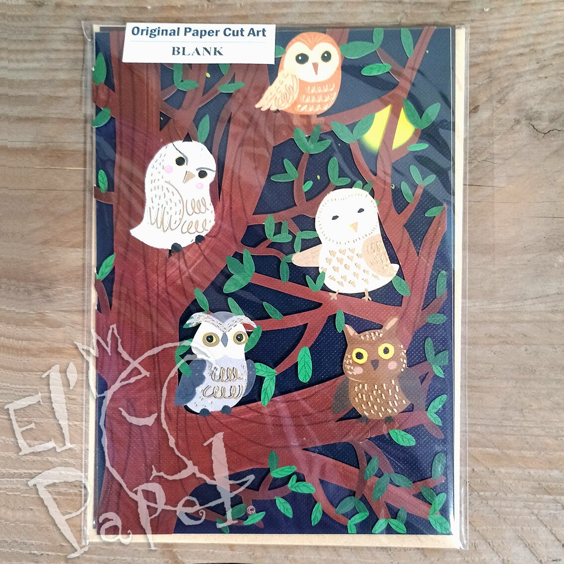 Originele, leuke (ragfijn met een laser uitgesneden) wenskaart met de illustratie van verschillende uiltjes in een boom.