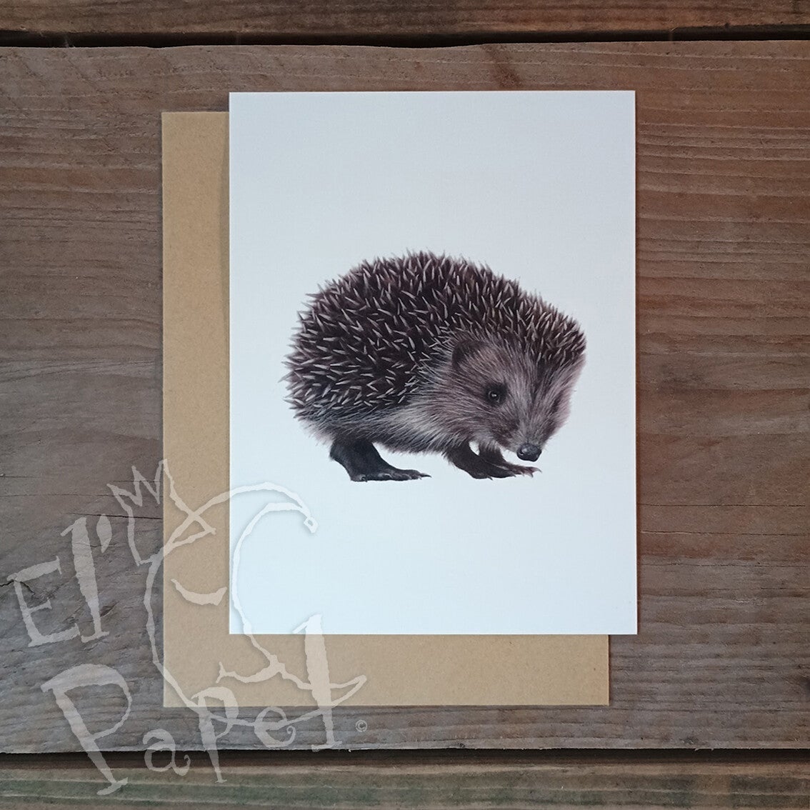 Ansichtkaart met een super schattige en realistische tekening van een wandelend, jong egeltje.