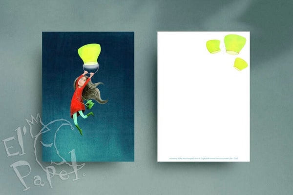 Prachtige illustratiekaart met van een meisje dat in de lucht hangt, aan een lichtballon.