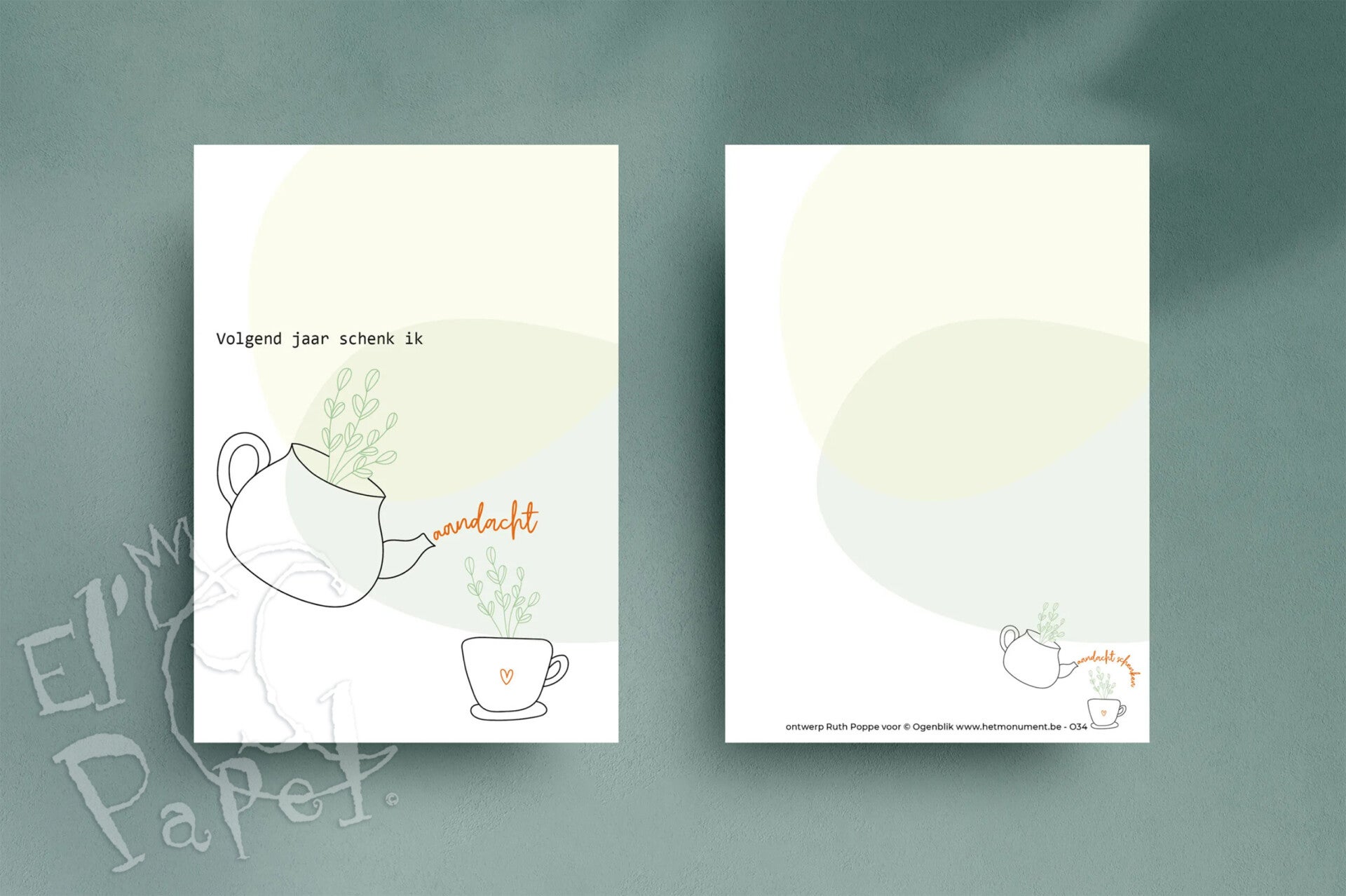 Mooie illustratie- & quote kaart in zachte groen-geel tinten, een theepot en -kopje in lijnillustratie, met erboven de tekst "Volgend jaar schenk ik" en uit het tuitje komt - in rood - het woord " aandacht". Dus "Volgend jaar schenk ik aandacht".