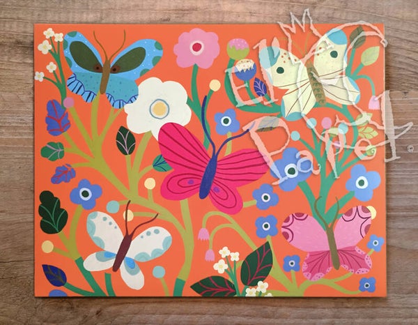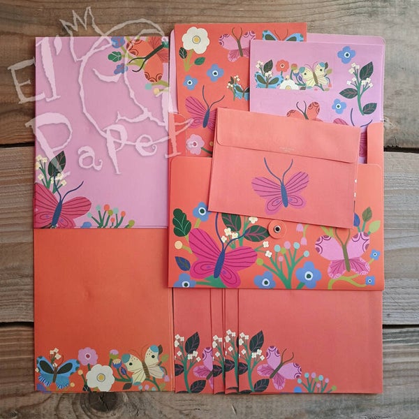 Prachtige, luxe Roger la Borde writing set 'Butterfly Ball' (vert. 'Vlindertuin'), met allemaal kleurrijke (fantasie-) vlinders en vrolijke bloemen tegen een warm-oranje achtergrond.