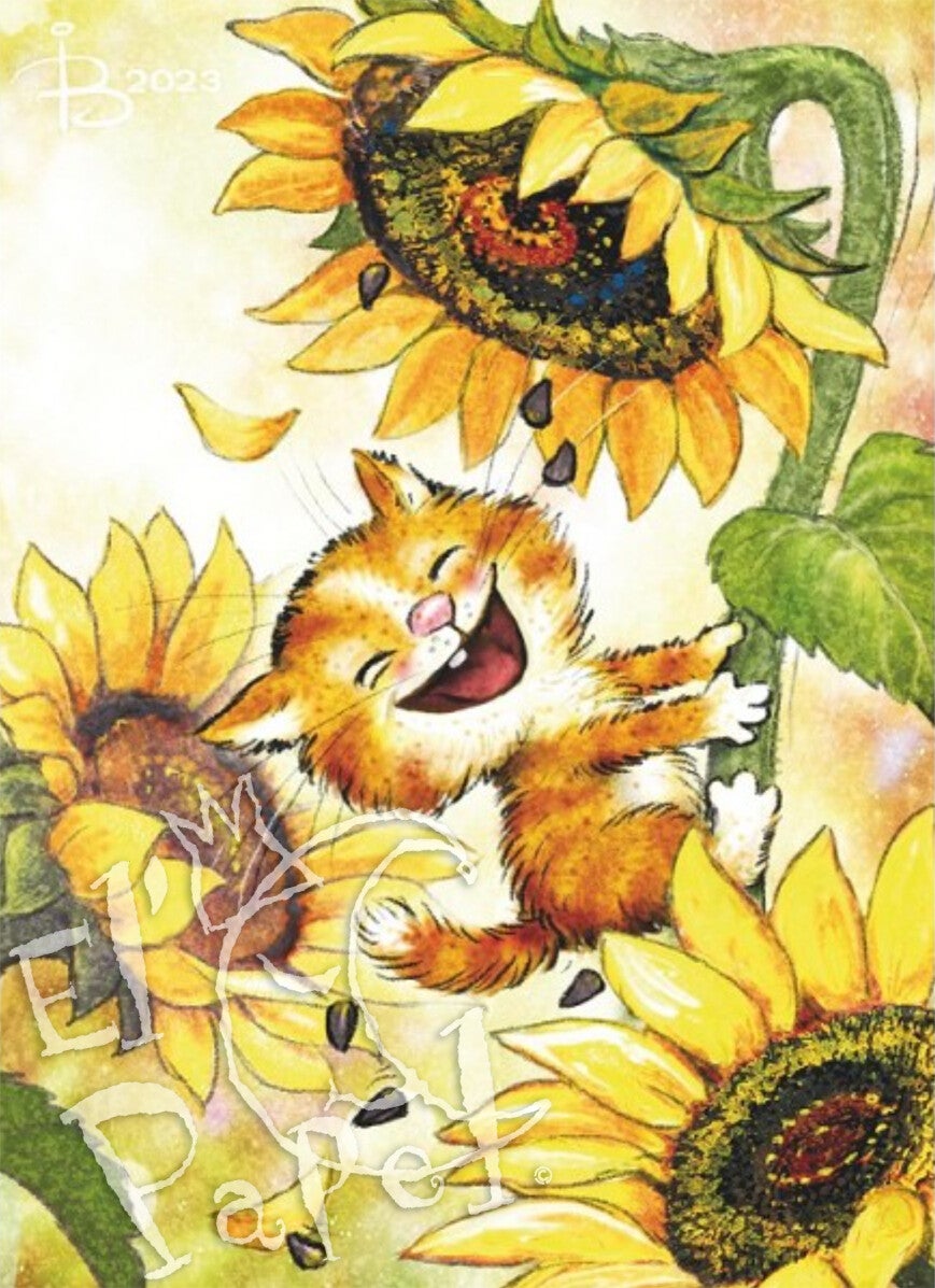 Een van de Blauwe Katten kinderen (de ginger) hangt in een zonnebloem (in een zonnebloemenveld) en schudt de zaden eruit.