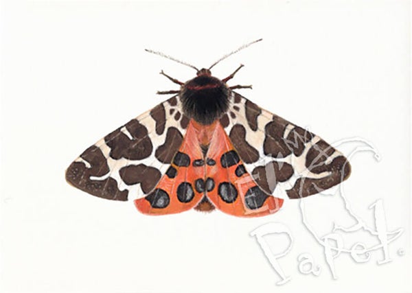 Ansichtkaart met een prachtige, realistische tekening van een vlinder: de oranje-bruine Grote Beer, tegen zachtgele achtergrond.