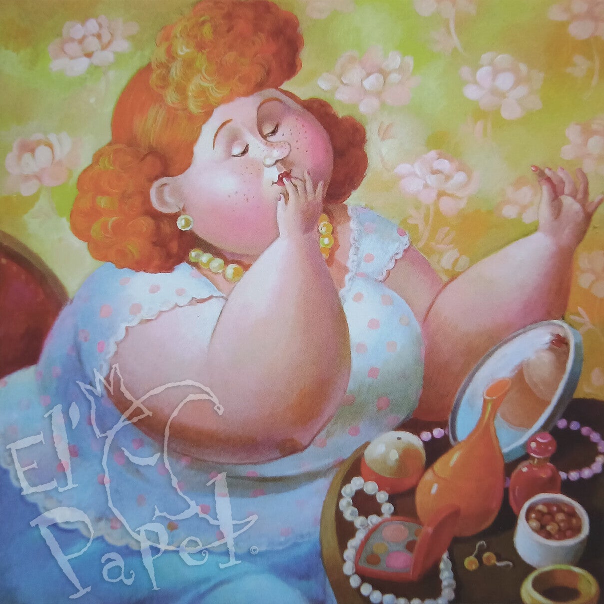 Zo'n leuke ansichtkaart, met een roodharige 'dikke dame' in een kamer met geel rozenbehang, aan een tafel met toilet- en make-up spulletjes, terwijl ze haar lippen rood stift.