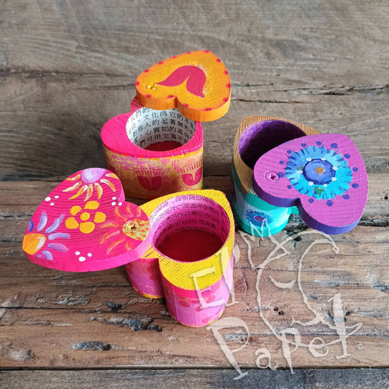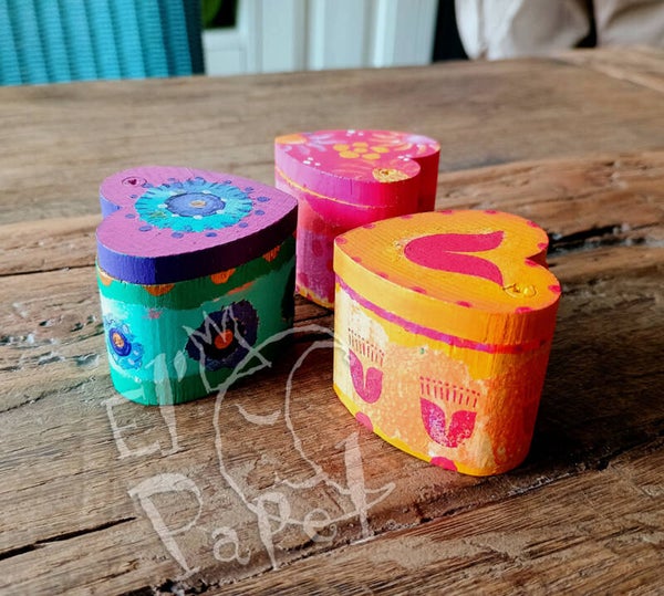 Het doosje is van hout, maar met mixed media technieken gedecoreerd en deels met de hand beschilderd.
