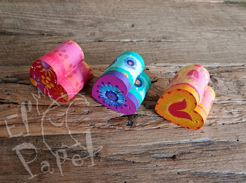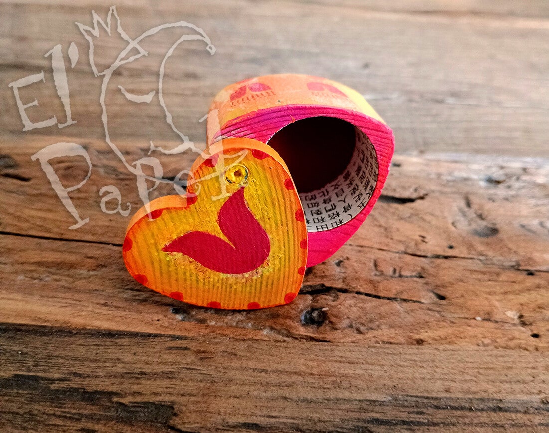 Uniek doosje om een bijzonder kado, zoals een trouwring, in te geven of om speciale dingen in te bewaren, met als hoofdkleuren geel met rood en hartvormpjes op de zijkant en op het deksel.
