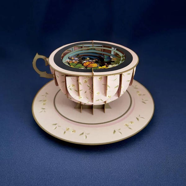 Fantastische 3D 'TEA' Pop Up kaart met een voorstelling in het kopje. Gewoon plat te versturen en heel makkelijk uit te klappen tot een kop met schotel.