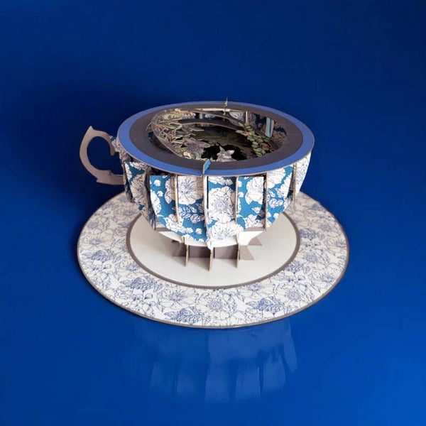 Fantastische 3D 'TEA' Pop Up kaart met een voorstelling in het kopje. Gewoon plat te versturen en heel makkelijk uit te klappen tot een kop met schotel.