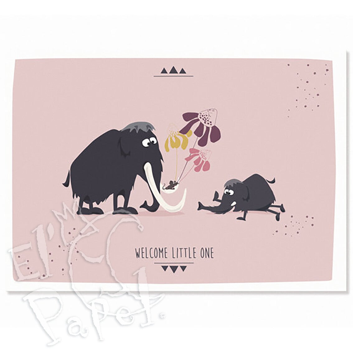 Heel leuke en originele geboortekaart met de mammoeten Gundula, Ove en muis Philippe, met bloemetjes en onderaan de kaart de tekst 'Welcome Little One' (vert. 'Welkom kleintje').