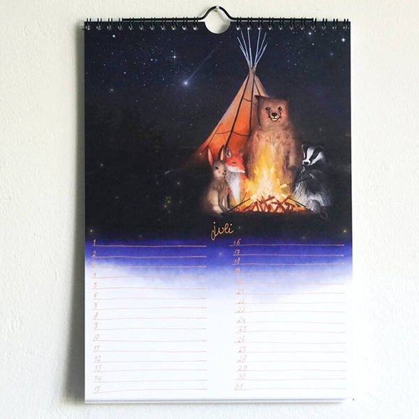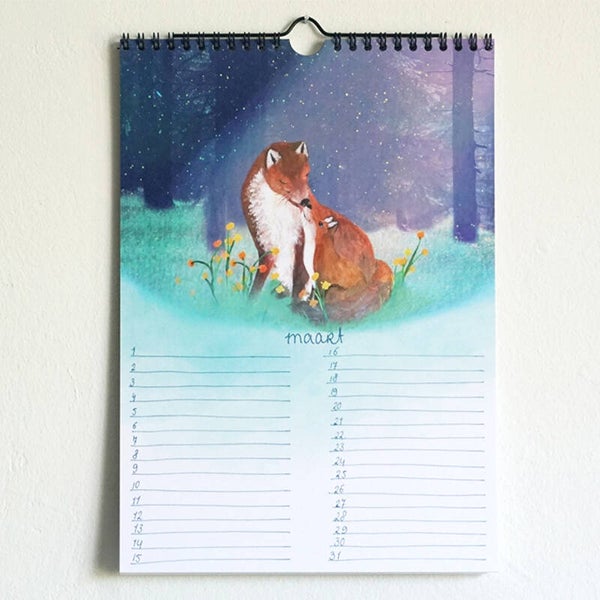 Beer, vos, das, muis en haas gaan een jaar lang op avontuur. Vergeet nooit meer een verjaardag, met deze prachtige vrolijke verjaardagskalender in formaat A4. Elke maand als je de kalender omslaat is het weer feest met een nieuwe vrolijke illustratie die past bij het jaargetijde en er is genoeg ruimte om verjaardagen en belangrijke gebeurtenissen op te schrijven. De kalender is op dik, papier geprint, en is ingebonden met een wire-o binding. Hierdoor kan je hem makkelijk omslaan én ophangen.