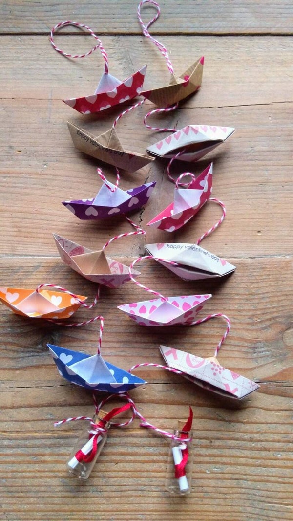 Een slingertje met 6 love-boats, gevouwen van restjes papier. Onderaan een flesje met een briefje voor de liefdesverklaring.