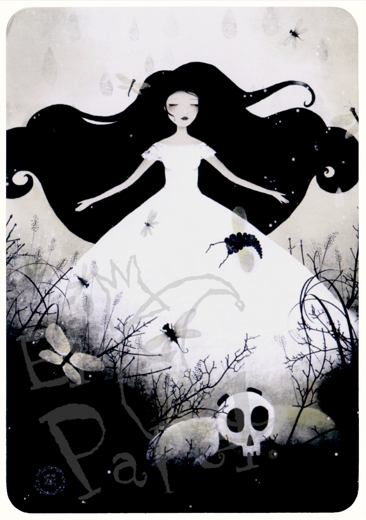 Prachtige, beetje 'spooky' ansichtkaart van vrouw met lang zwart haar in witte jurk en op de voorgrond een schedel, door Anne-Julie Aubry!