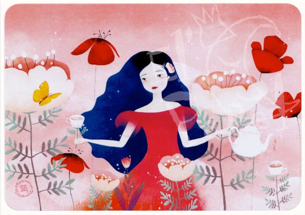 Prachtige, zomerse illustratie-kaart 'Tea Garden' met vrouw met theepot tussen verschillende gote bloemen, een paar theekopjes bovenop bloemstengels. Illustratie: Anne-Julie Aubry!