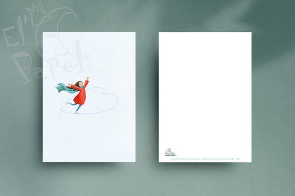 Winterse illustratiekaart van blije schaatsenrijdster, die een hart-vorm schaatst.