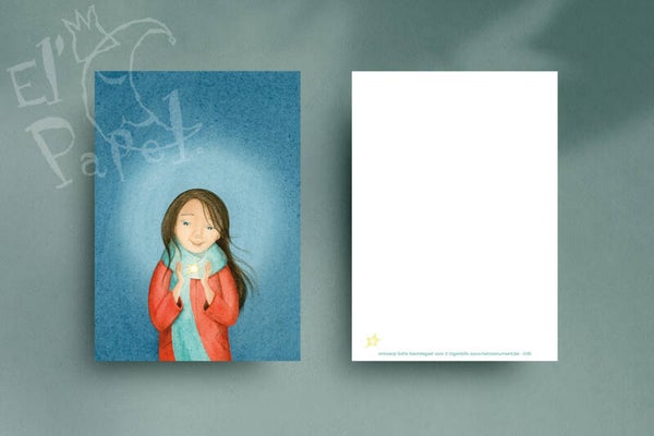 Prachtige illustratiekaart met illustratie van jonge vrouw met blauwe sjaal en rode jas met een schijnend sterretje tussen de handen.