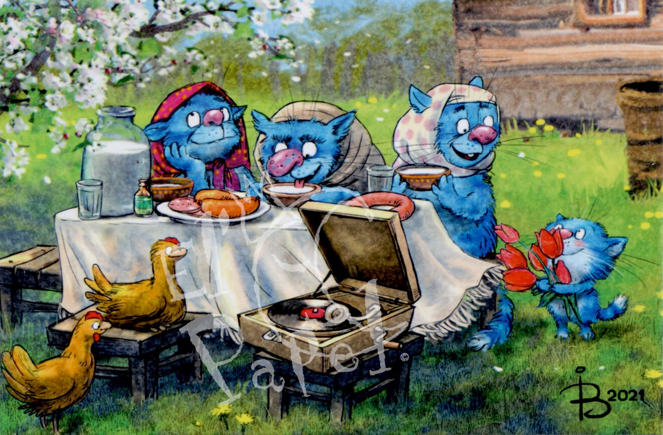 Kaarten met een glimlach, deze leuke kaarten met de Blauwe Katten van Rina Zenyuk (Irina Zeniuk).