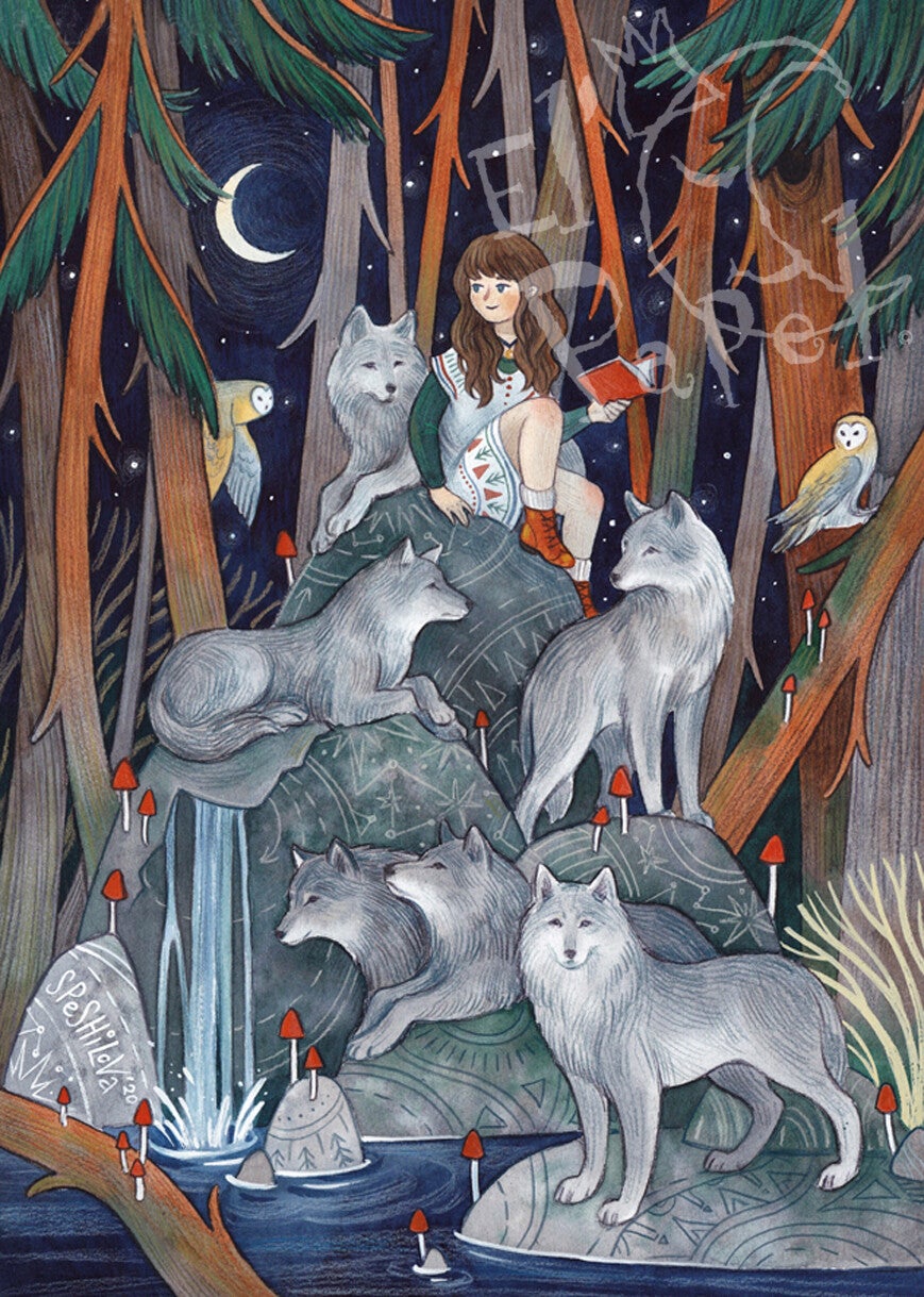 Sprookjesachtige kaart(en) met jonge vrouw omringd door wolven.