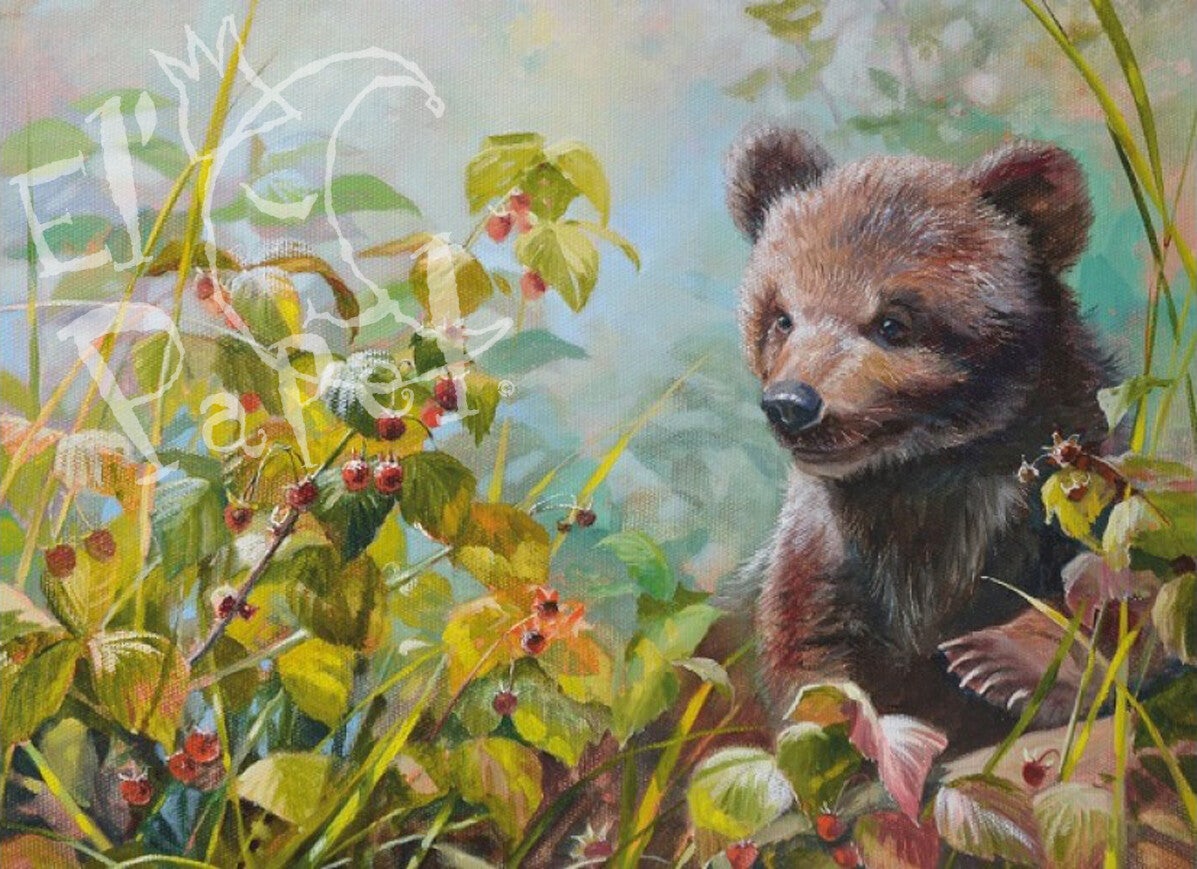 Ansichtkaart met schattig bruin beertje (jonkie), zittend op een open plek in het bos, smullend van de wilde aardbeitjes.