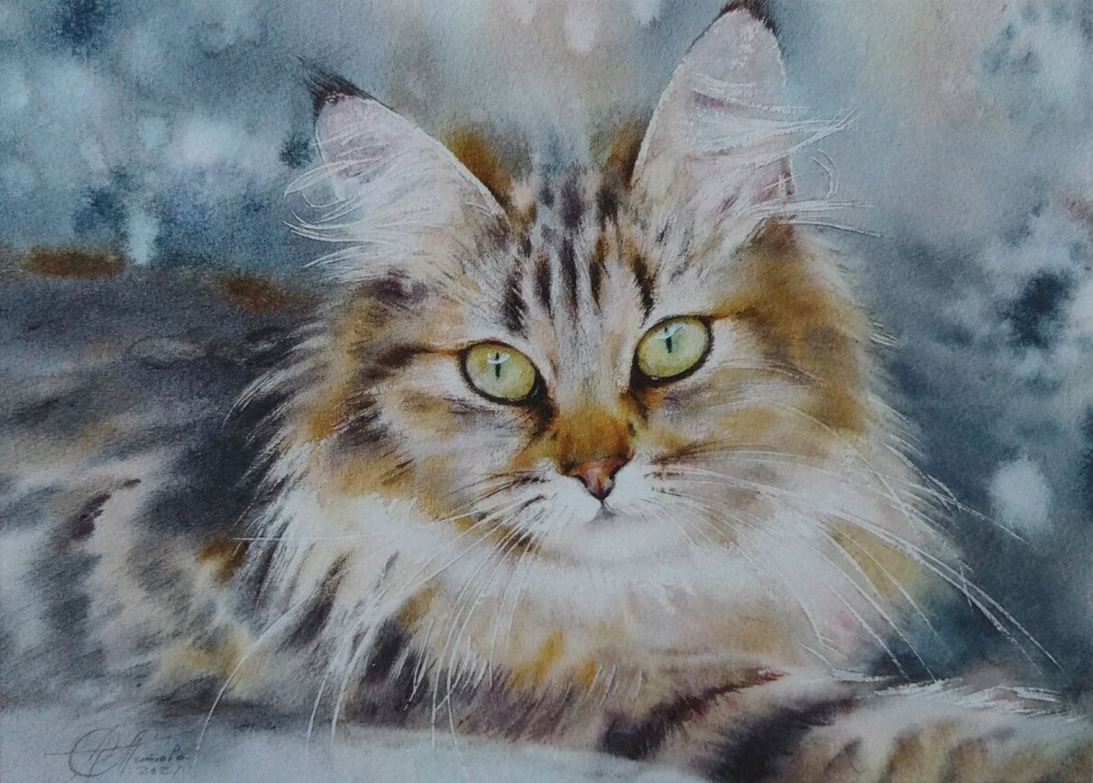 Ansichtkaart met aquarel van liggende gestreepte kat met lichte groengele ogen.
