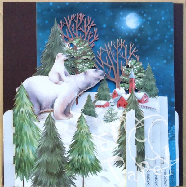 Fantastische 3D Kerst Pop Up Cards met een prachtig ragfijn laser uitgesneden winterse voorstelling van Kerstlandschap met ijsberen. De kaart heeft uitgevouwen 5 lagen en wordt dan een 3D voorstelling.