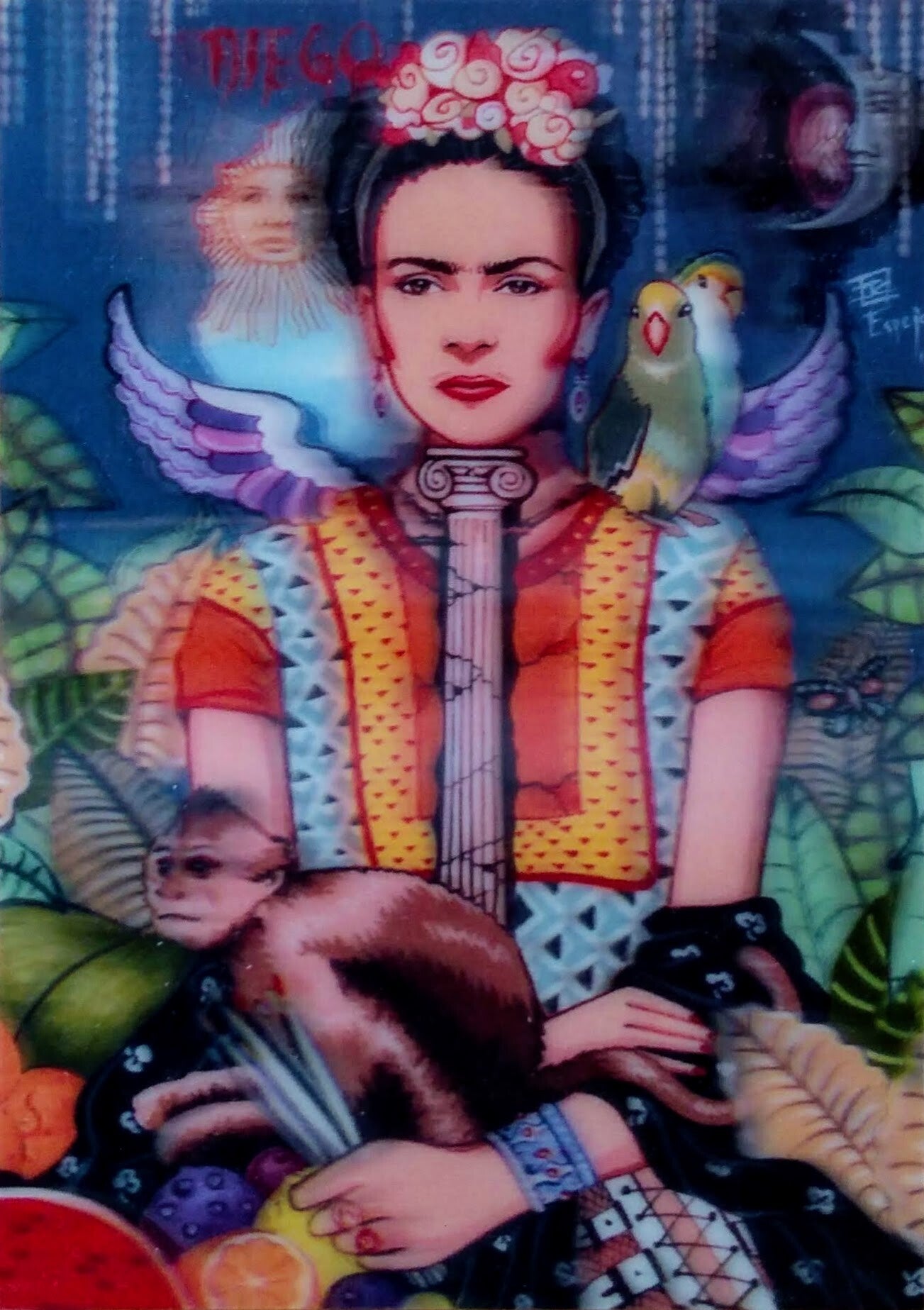 Gave 3D-ansichtkaart van in traditioneel kostuum geklede Frida Kahlo, kleurrijk zoals zij zelf was, omringd door tropische planten, fruit en dieren.