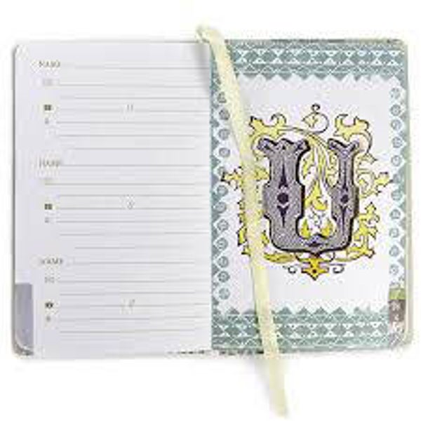In de rug gebonden pocket- adresboekje met goudfolie accenten en markeer-lint. Afmeting paginas ca. 90 x 146 mm.