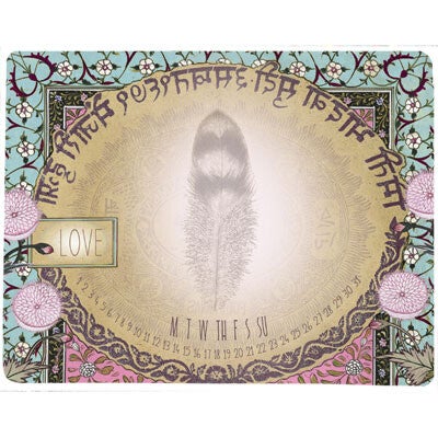 Decoratieve muismat met prachtig versierde rand en een veer in het midden.